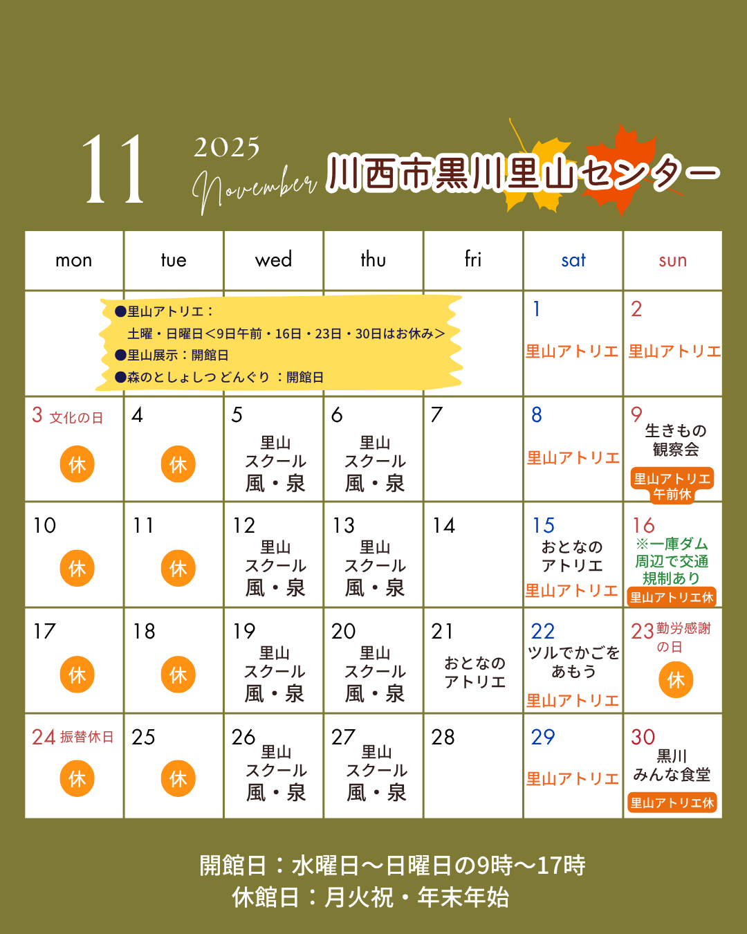 🔶 11/23(日) は祝日のため休館日です。